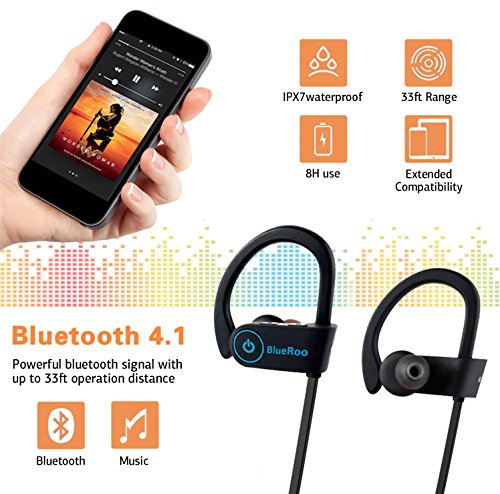 -. Binding : Wireless Phone Accessory -. Brand : BlueRoo -. Color : Blue -. EAN : 9369998008285 -. Feature : ✔️ PREMIUM HD STEREO SOUND From listening to music to taking calls with CV 6.0 NOISE CANCELLING Technology you have an authentic audio listening experience with deep bass and crystal clear treble no matter where you are / ✔️ BLUETOOTH 4.1CSR WIRELESS Technology you get premium audio performance without wires and take your music anywhere you go Wireless freedom meets powerful sound Connect with all Bluetooth enabled devices IOS Android up to 33 feet away / ✔️ EARBUDS Ergonomically design flexible ear hooks to fit comfortably firm in place for your all day wear with a variety of soft silicone earbuds and lightweight neckband maximise comfort and stability to handle your tough training / ✔️ ION POLYMER BATTERY Longest battery life lets you enjoy True High Definition music up to 8 hours enough time to listen to your entire playlist 240 hours standby and with BlueRoo exclusive PowerIQ and VoltageBoost combine to deliver the fastest possible charge in just 1.5 hours / ✔️ WATERPROOF and Sweat proof rated for your comfort so you can rely on them for your most intense workouts This is the best gift men women girls and boys birthday or Christmas BONUS ACCESSORIES Charging cable for IOS and Android devices and Travel carry case 1 Year Manufacturer.s Warranty and 30 days return policy BUY NOW with CONFIDENCE Best value for money guaranteed -. Label : BluRoo -. Manufacturer : BluRoo -. OperatingSystem : Android IOS -. PackageQuantity : 1 -. ProductGroup : Wireless -. ProductTypeName : WIRELESS_ACCESSORY -. Publisher : BluRoo -. Studio : BluRoo -. Title : Bluetooth Headphones Wireless Earphones with Mic IPX7 Waterproof Sweatproof HD Stereo Sound Noise Cancelling Earbuds for Workout Running Gym Indoor Outdoor Lightweight Headsets for Sports 8H Battery -. Warranty : Manufacturer warranty 30 days from the purchase