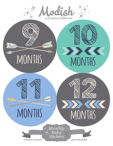 -. Title : 12 Monthly Baby Stickers, Blue, Teal, Gray, Tribal, Arrows, Chevron, Baby Boy Month Stickers, Baby Book Keepsake, Baby Shower Gift