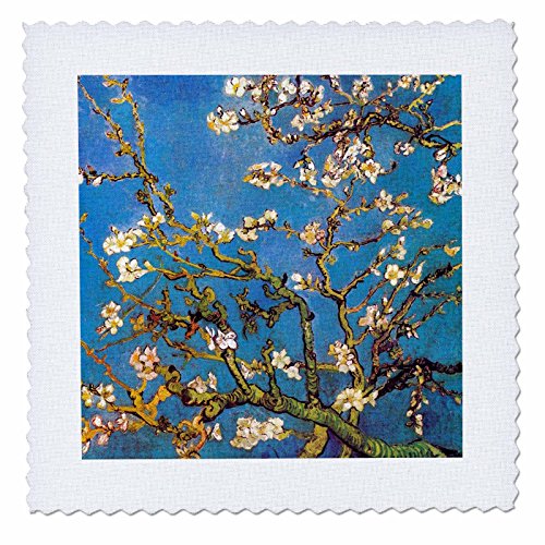 3dRose qs_155639_5 Almond Blossoms by Vincent Van Gogh 1890 Famous Fine Art by Masters White Flower Branches on Blue Quilt Square, 14 by 14-Inch