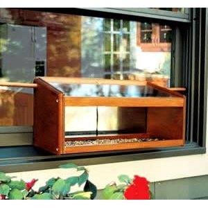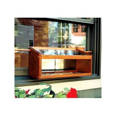 -. Feature : One-way mirrored panels allow viewing of feeding birds / Easily installs on windowsill / Designed for closing and locking of window / Held securely with two dowels (included) / 19" W X 9 ¼" H X 8" D