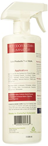 -. Binding : Misc. -. Brand : Unique -. EAN : 0736683000562 -. Feature : NO MIXING - Trigger Sprayer - Ready To Use 24 oz. / WORKS ON NEW AND OLD MESSES / REMOVES THE TOUGHEST ODORS / PREVENTS RE-SOILING by eliminating pheromones / NO MASKING - Advanced probiotic blend eliminates stains and odors / CLEANS DOWN TO THE FLOORBOARD Removes stains and odors down to the subfloor / WORKS FAST - Removes most stains on contact / SAFE FOR YOUR FAMILY AND PETS - No caustic or harsh chemicals / DOGS AND CATS - Removes waste and odors from dogs and cats / CLEANS VOMIT, URINE AND FECES - Removes all organic waste, stains, and odors -. Label : Unique MM -. Manufacturer : Unique MM -. Model : 206-A -. MPN : 206-A -. PackageQuantity : 1 -. PartNumber : 206-A -. ProductGroup : Pet Products -. ProductTypeName : PET_SUPPLIES -. Publisher : Unique MM -. Studio : Unique MM -. Title : Unique Natural Products 206-A Pet Odor and Stain Eliminator -. UPC : 736683000562