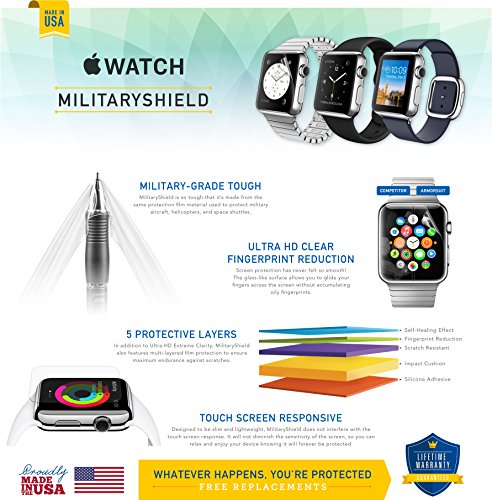 -. Feature : ArmorSuit MilitaryShield Kit for Apple Watch 42mm (Series 2) includes our MilitaryShield piece(s), Installation Solution, Squeegee, Lint-free cloth, and Installation Instructions. / Ultra HD Clear and amazingly thin, perfectly matches the contours of your device. Easy application with flexible material is designed for maximum full coverage on curved corners and edges on your device. / Created from scratch-proof, ultra-tough, optically clear, military-grade, yellow-resistant material and is custom fit for each particular gadget and device with full body and screen protection. / MilitaryShield has self-healing technology, which helps eliminate minor scratches on the film all by itself. Significantly reduces dust, oil and fingerP.R.Int smudges. / ArmorSuit stands behind the quality of our MilitaryShield products to ensure 100% Satisfaction to all of our customers. All ArmorSuit MilitaryShield products are backed by Lifetime Replacement Warranty. Made in USA.