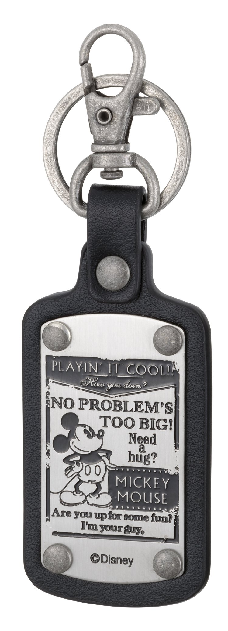 A metal plate printed with Mickey and English sentences was struck by genuine leather with a thickness of about 4 mm. On the other side (back side) of the plate Mickey 's silhouette was embossed and made fancy. Genuine leather is firm, hardly smelled. The way to connect with the item is ring or carabiner, but I could not attach it to the metal fittings of my bag that I tried to attach small. It will not be a problem if it is an ordinary smart key or house key.