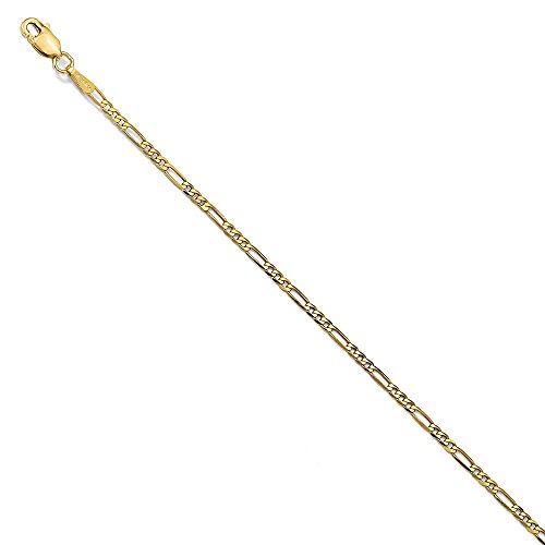 Round and oval links made of polished 14k yellow gold interlock in a reoccurring three and one pattern that closes with a lobster claw clasp. The easy elegance of a flat Figaro chain looks great with dress or casual wear and the 1.8mm width is perfect on its own or paired with other chains for a layered look. 9-inch bracelet or anklet lengthFeature