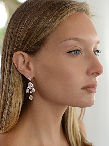 These dramatic Rose Gold clip on chandelier earrings have it all - dazzling runway glamour, a perfect medium-size silhouette and a lightweight clip design for day-into-night comfort. Make your grand entrance unforgettable with our gleaming pear-shaped clip dangle earrings crafted using only the finest AAAAA quality Cubic Zirconia. These luxurious Blush Gold baubles have super comfortable clips with cushion backs so you'll feel as great as you look! Mariell's designer bridal clip-on chandeliers are guaranteed to make a glistening Red Carpet statement at your wedding, formal, pageant or any special occasion. We promise you'll love these top selling dangles or your money-back. Who needs diamonds when you have these spectacular Zirconium statement earrings with a breathtaking Pink Champagne glow! Treat yourself or someone you love to some seriously gorgeous sparkle. Plated in Genuine 14 KT Rose Gold. Lifetime Guaranteed.Feature