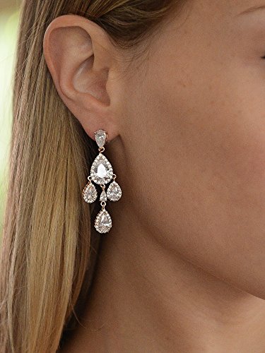 Stunning Rose Gold Clip-On Chandelier Dangle Earrings with Gleaming Pear-Shaped CZ Pave Halo Frames; Clip Backs with Comfort Cushions