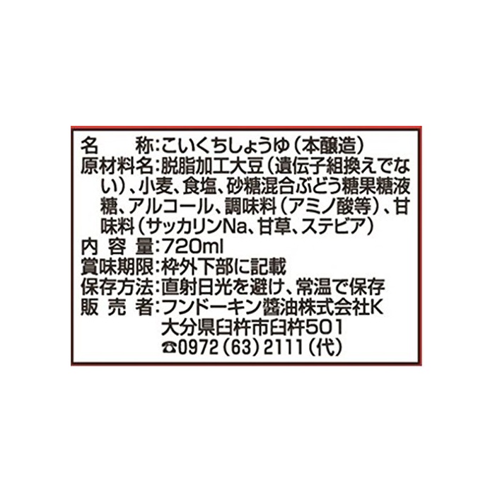 원재료:탈지가공 대두(유전자조 교환이 아니다)고, 밀,식염,설탕 혼합 포도당 과당액당,알코올,조미료(아미노산등)고, 감미료(사카린Na,감풀,스테 비어)