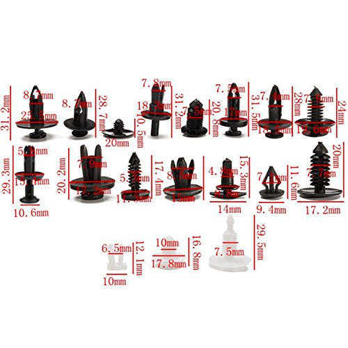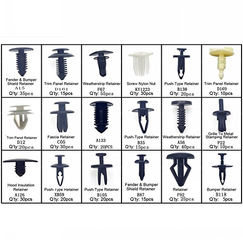 50pcs Weatherstrip Retainer 50pcs Square Screw Nut 40pcs Hood Insulation Retainer 40pcs Fascia Retainer 40pcs Weatherstrip Retainer 30pcs Hood Insulation Retainer 20pcs Fir Tree Shield Retainer 20pcs Bumper Cover Push Type Retainer 20pcs Push Type Retainer 15pcs Door Trim Panel Retainer 15pcs Lower Trim Panel Retainer 15pcs Front Bumper Stone Deflector Retainer 15pcs Bumper Push Type Retainer 10pcs Inner Fender Push Type Retainer 10pcs Push Type Retainer 10pcs Trim Panel Retainer 10pcs Grille To Metal Stamping Retainer 5pcs Tail Light Retainer