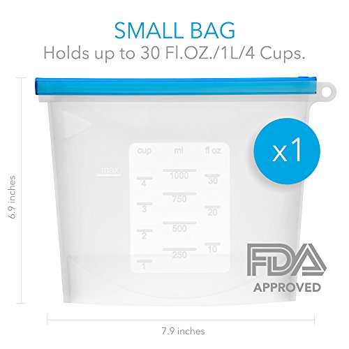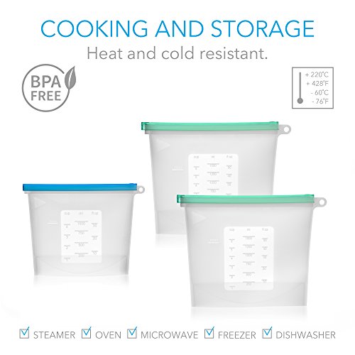 Pack your food into AIRTIGHT SILICONE FOOD STORAGE BAGS directly at the grocery store, refrigerate or freeze, marinade before cooking, microwave or boil, reheat, even eat out of & finally save your leftovers for lunch at work.