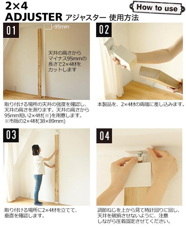 | 天井や床を傷つけずに2×4材を柱として突っ張ることができます 工具も必要ありませんジャッキを回すだけでしっかり固定できるので女性でも簡単です |