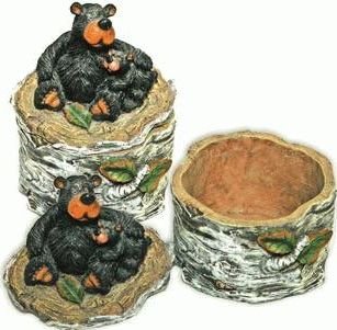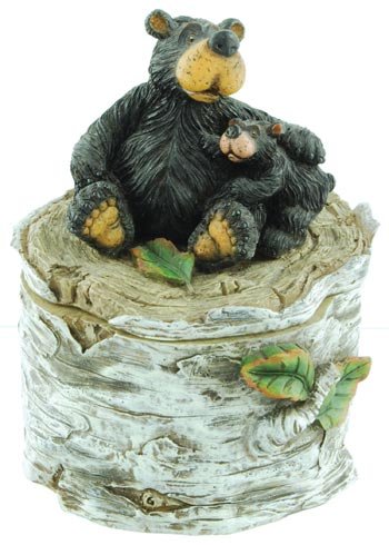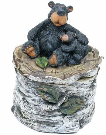 Willie Black Bear & Cub on Birch Log, Trinket Treasure Box 5.5-inch