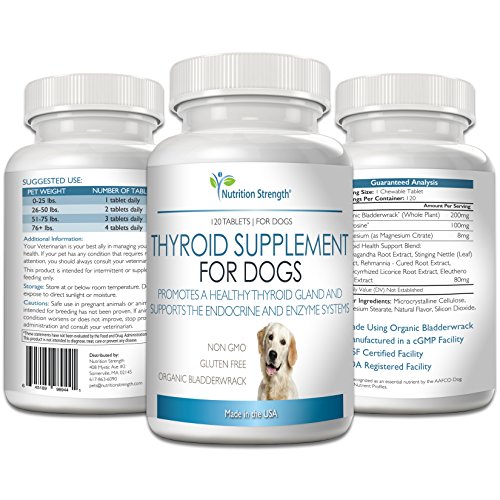 NATURAL THYROID SUPPORT FOR DOGS: Nutrition Strength's Thyroid Supplement for Dogs, Natural Support for Hypothyroidism in Dogs with Organic Bladderwrack is made with the highest quality FDA-approved ingredients. It is specifically designed to provide the nourishing and support for a healthy thyroid function. Manufactured using the highest standards, our tablets are safe for use with your dog's other medications. Using our supplements on a regular basis can prevent trips to the vet with thyroid p