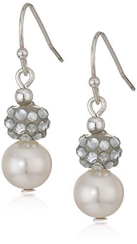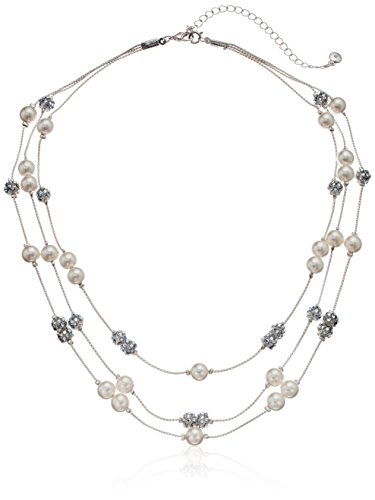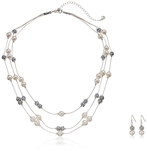 Silver tone necklace featuring simulated cream pearls with fireball accents in an illusion design with matching drop earring