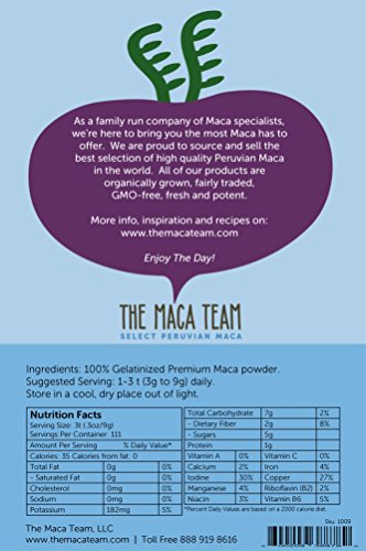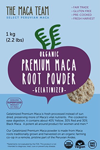 Our Premium Gelatinized Maca powder is made using a unique process. Instead of being sundried after harvest, the fresh roots are immediately cleaned, ground into a pulp and low temperature dried to produce a powder, which is then gelatinized to dissolve most starch content. This careful and quick handling preserves more vital nutrients of the Maca roots and makes for a significantly more potent product. Gelatinized Premium Maca is easier to digest than a Raw Maca powder making it suitable for the majority of people. It takes about 4 kg of Raw Maca roots to produce 1 Kg of Gelatinized Maca powder, making it more concentrated than Raw Maca. Our Premium Maca powder contains a combination of about 30% Red, 40% Yellow and 30% Black Maca roots. Given the special handling and combination of Maca colors, Premium Maca Powder is in our opinion the best all-purpose Maca for both Men and Women. Our Gelatinized Premium Maca is pre-cooked, certified organic and fairly traded. The Maca Team, LLC is dedicated to preserving and sharing high quality Peruvian grown Maca with the world. As a family run company of Maca specialists, we're here to bring you the most Maca has to offer. We are proud to source and sell the best selection of high quality Peruvian Maca in the world. All of our products are always organically grown, fairly traded, GMO-free, fresh and potent. We sell 8 different kinds of certified organic Maca, raw and gelatinized (pre-cooked), in a variety of sizes, in vegan capsules and extracts. Please see our seller profile for more details and links to our products. Thank you for considering The Maca Team. Enjoy your day!Feature