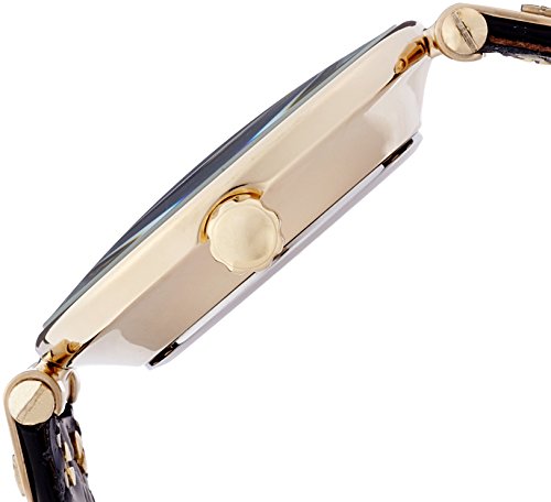 - Feature : Gold-tone watch featuring croco-grain leather strap with screw-accented lugs and black dial with Roman numeral and glitter hour markers / Metal 34.0 mm case and mineral dial window / Japanese-quartz movement with analog display / Leather calfskin band with buckle closure / Water resistant to 30 m (99 ft)