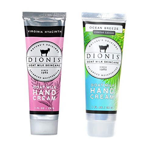 - Two item set that includes two 1-oz tubes of Dionis Goat Milk Hand Creams in Virginia Hyacinth and Ocean Breeze scents.