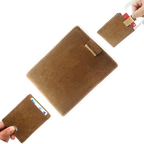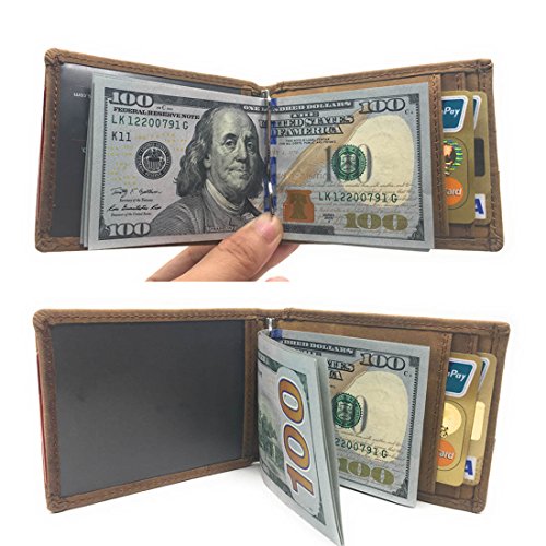-. Feature : SAFETY and SECURITY--the RFID blocking wallet is made of a unique metal composite, engineered specifically to block 13.56 MHz or higher RFID signals and protect the valuable information stored on RFID chips from unauthorized scans / SLIM and STYLISH -- the bifold wallet made of full grain genuine leather, designed quick Access ID Windows, best fits 6-8 cards plus US bills with no bulk, and a minimal Pull-tab design to reduce bulk - Wallet Size: 4" x 3" x 4" inch. / HOW IT WORKS -- a front pocket made for your most used card. 2 slots on the inside, a photo ID window, and a metal money clip to hold your cash. Wallet case also has smart pull-strap for quick access to your everyday cards. / No hassle money back guarantee. 100% Risk-free purchase.