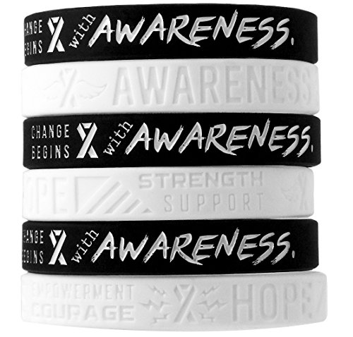 - Pack of 12 silicone awareness wristbands with white/neutral awareness ribbon color theme