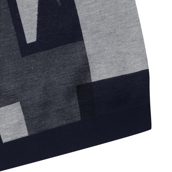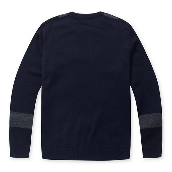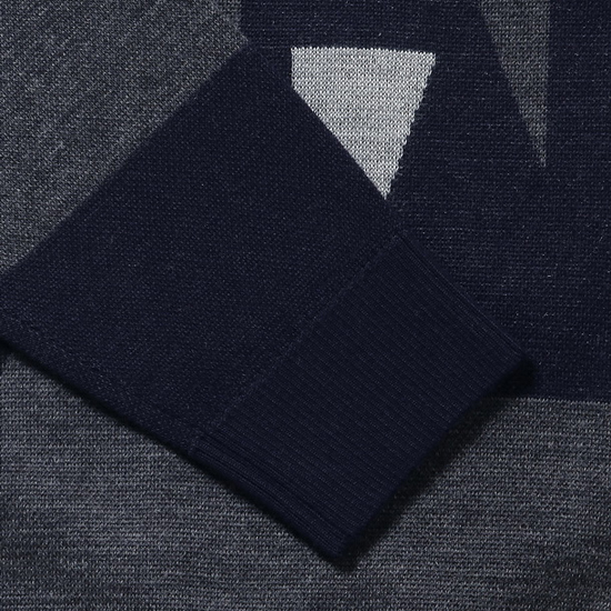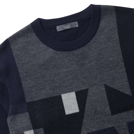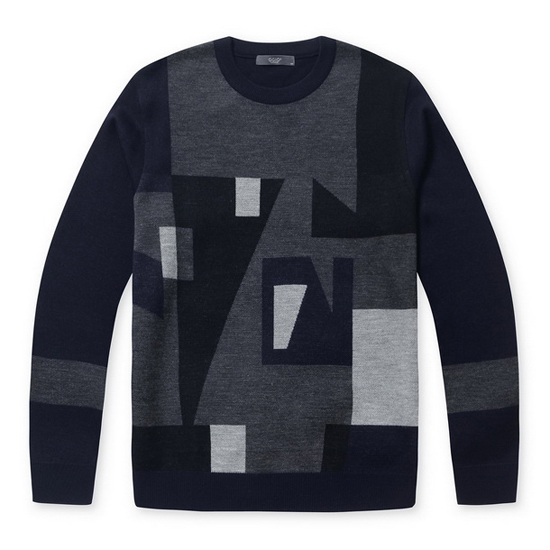 - 앞판의 톤온톤 면분할 패턴을 적용한 남성 니트.