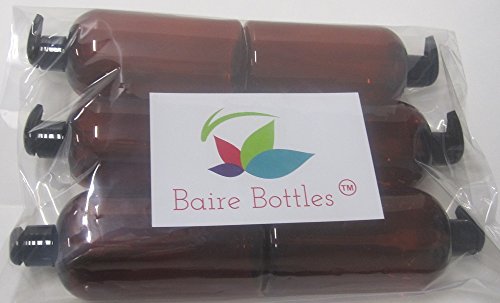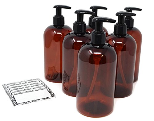 BROWN AMBER PLASTIC LOTION PUMP BAIRE BOTTLES - 16 OZ REFILLABLE Black LOTION Pumps - 6 Pack, BONUS 6 DAMASK LABELS - PET, Lightweight,...