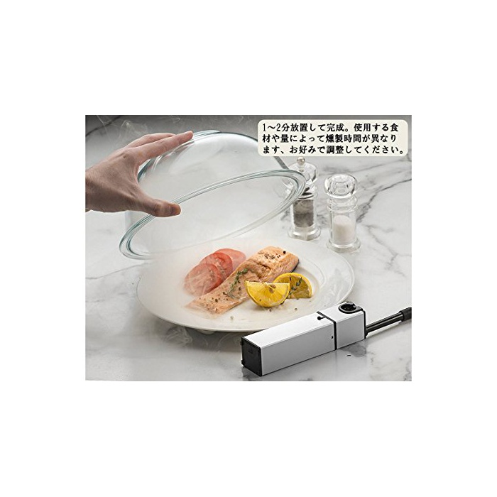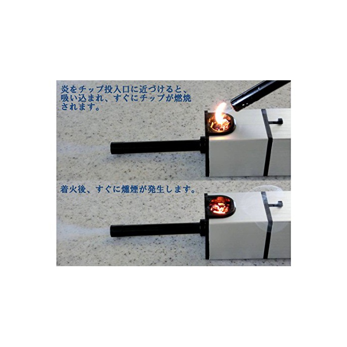사용법은 매우 간단,우선 #연을 밀폐 할 수 있는 용기에 식재료를 넣겠습니다.본체에 전지를 장전하고, 팁(칩) 투입구에 2~3안주 정도의 팁(칩)를 만들어 넣음(담는 그릇·상자 등),전원을 On으로 합니다.마지막에 호스를 용기내에 끼워넣고, 라이터 등에서 팁(칩)로 점화 하면 #연이 용기내에 충전됩니다.그대로1~2분정도(쯤) 방치 해 완성.식재료나 분량,훈제 시간 로 인해 향기의 힘이 변하기 때문에,주문으로 조정해 주십시오.