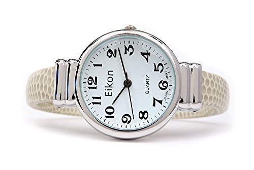 Brand, Seller, or Collection Name:Eikon Part Number:STC Item Shape:Round Dial window material type:Glass Display Type:Analog Clasp:Bangle Case material:Stainless steel Case diameter:30 millimeters Case Thickness:9 Band Material:Stainless steel Band length:Women's Short Band width:10 millimeters Band Color:Beige Dial color:White Bezel material:Stainless steel Bezel function:Stationary Special features:Fashion timepiece Movement:Japanese quartz