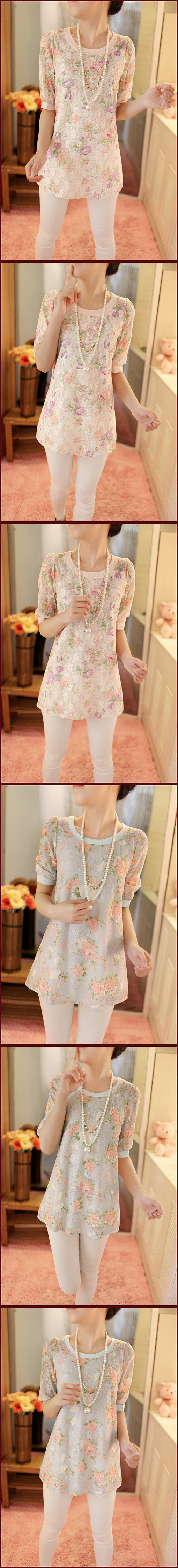 夏装新款大码女装中袖圆领打底衫泡泡袖中长款印花蕾丝雪纺衫