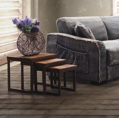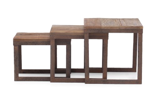 -. Feature : Perfect for those small spaces, the Civic Center nesting tables slide together for a space saving design. Pull them out for extra table top space. Tops are from solid elm and the base is antiqued metal. / Also Available with side table, coffee table and bench / High quality wood construction / Distressed Natural, Color may slightly different from the pic. / Metal, Fir Wood. W15.7 x D15.7 x H16 (L), W13 x D15.7 x H14 (M), W10 x D15.7 x H12 (S) / Commercial Grade. Fully Assembled