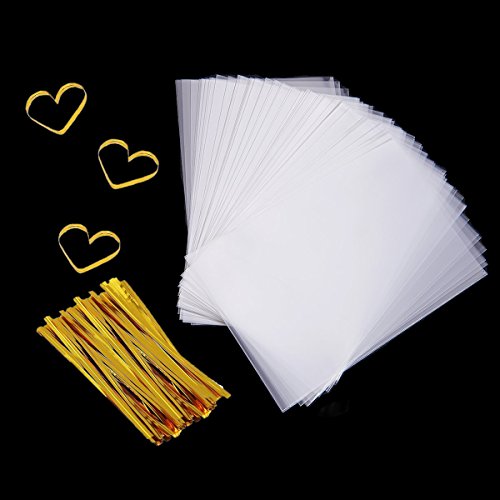 Clear cellophane treat bag: Flat bag, 4 inch by 6 inch; 70 Micron thick with 200 PCS Metallic twist ties: Gold, 2mm*80mm