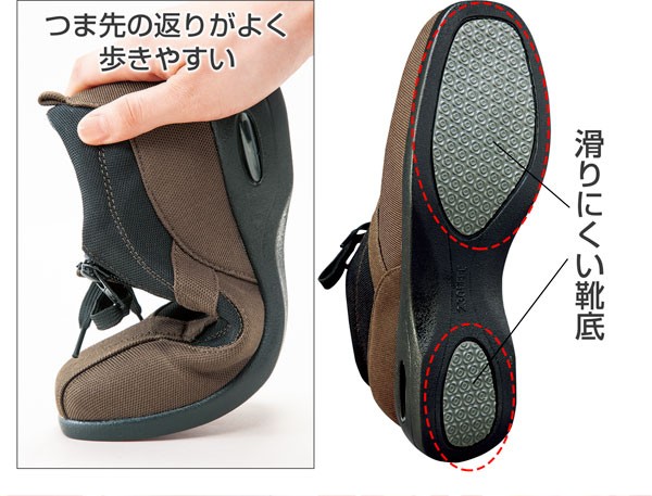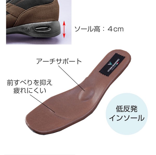 | 優しい履き心地の機能性シューズ。足入れがよくエアークッション内蔵のソールと低反発インソールで気持ちのいいフィット感。インソールにはアーチサポート機能と前すべり防止機能があり疲れにくい。普段履きにもウォーキングにも。様々なシーンで使える。 |