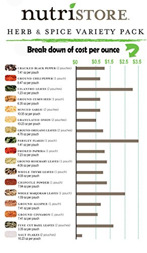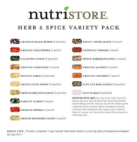 -. Feature : SAVE BIG OVER GROCERY STORE P.R.ICES - Our bulk packaging is designed to save you money on those essential herbs and spices used in your favorite recipes. / 15 YEAR SHELF LIFE - Packaged for an optimal shelf life so you can rest assured you have your favorite herbs and spices no matter the circumstance! / 17 ASSORTED HERBS & SPICES - This kit contains the following: Minced Garlic (2), Basil Leaves, fine-cut (2), Granulated Onion (2), Cilantro Leaves (2), Cracked Black Pepper (2), Ground Oregano Leaves (2), Salt Flakes (2), Parsley Flakes, Whole Marjoram Leaves, Ground Chili Pepper, Whole Thyme Leaves, Ground Cumin Seed, Ground Allspice, Smoked PaP.R.Ika, Ground Cinnamon, Ground Rosemary Leaves, and Chipotle Powder. / 24 Re-sealable mylar pouches - This ensures freshness and allows you to easily measure out the right amount each time. / Essential for meal preparation - Designed to save you on spices and herbs by buying in bulk allows you to store these for everyday use and emergency preparedness.