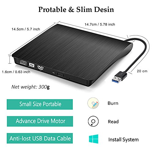 - USB 3.0 TECHNOLOGY: This ultra slim DVD burner adopted USB3.0 technology. High speed USB 3.0 external DVD drive for laptop with low impedance & anti-interference ability, bring you faster and smooth experience during movies, musics or burning.It allows faster data transfer speed. It is also compatible with USB2.0 and USB1.0.