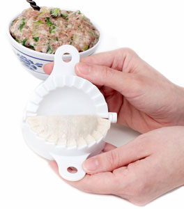 - To create the dumplings, place one wrapper on your dumpling press, spoon 1 1/2 tablespoons of the filing into the center of the wrapper, dot the edge of the wrapper with water, and bring the handles of the press together to seal the dumpling. If your filling squeezes out of the folds, decrease the filling to 1 tablespoon. Repeat with remaining wrappers.