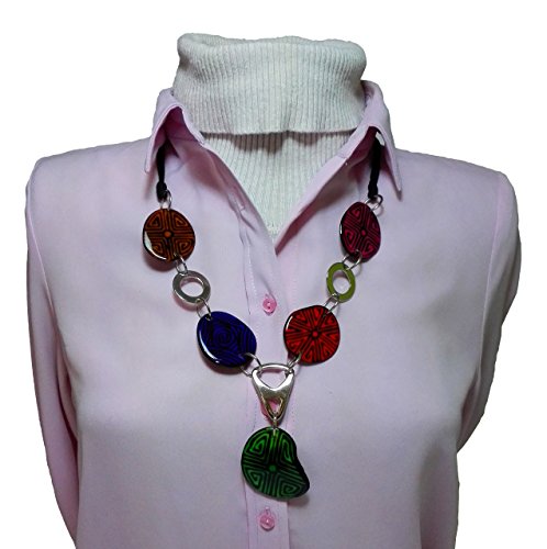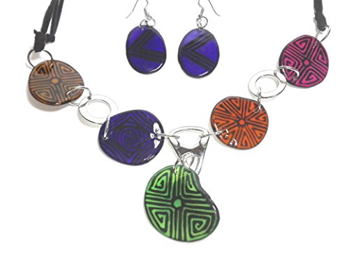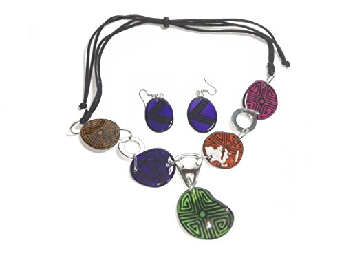 This beautiful necklace finds the balance in a lovely selection of colors applied in a beautiful handmade drawing on each of the pieces that are made in tagua seed which is grown in South America and after a refining process. a unique shine that will make you the center of attention of any place you visit, ideal for use with any combination of clothes, this exclusive accessory is mounted on a delicate suede leather band and interlaced in a fine hardware that gives a touch of unique elegance and high impact thanks to the earrings that accompany it.