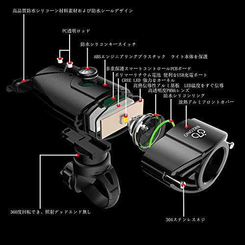 - 採用輝度1200ルーメン CREE社XM-L2 LED,(完成品自転車ランプの明るさは700〜800ルーメン)。