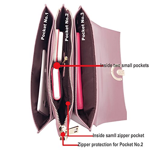 Structures: 1 small outside zipper pocket, 3 large compartments (including 1 zipper pocket) with Magnetic closure. The zipper compartment including 2 small open pockets & 1 small zip secret pocket. 1 Removable Adjustable Shoulder Strap and 1 clutch strap.