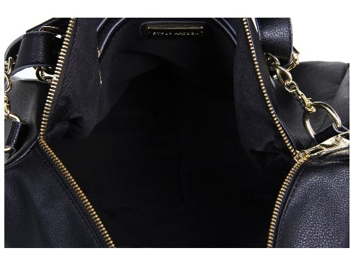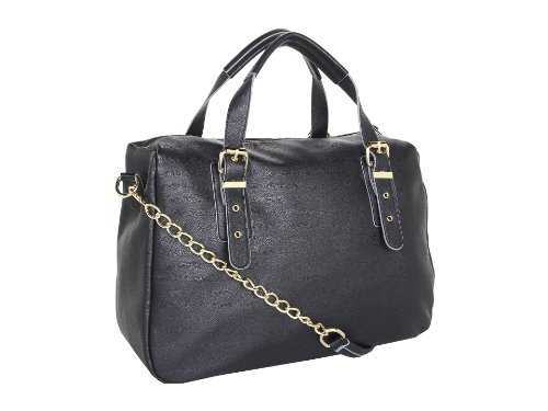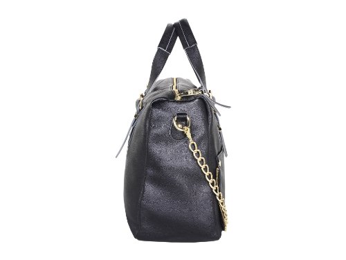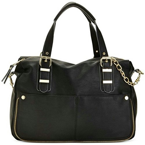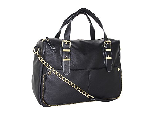 This classic faux leather carryall gets some attitude with this take-anywhere satchel from Steve Madden. Tailored with sturdy top handles, zipper edge trim detail and shiny gold detailing and zipper accents, it looks decidedly chic for work and going out especially with how this satchel can also be a crossbody handbag. Top zip closure, Adjustable top handles with detachable crossbody strap, Two exterior front slip pockets, Gold Polished hardware accents, Flat bottom supports upright structure, Lined interior with back wall zip pocket and multi functional slip pockets, Dimensions: L x 16" x D x 6" x H x 10.5" Handle Drop 5 ½", Strap Drop 14"Feature