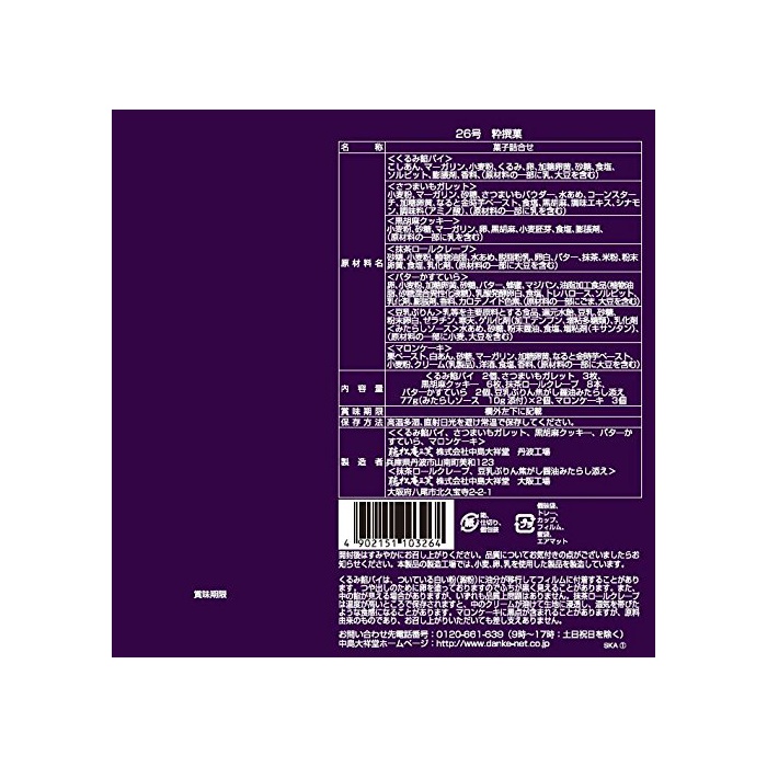 원재료:〈고구마《가렛토》〉소맥분,마가린,설탕,고구마 파우더,물엿,콘 스타《지》,가당계란 노른자,되면 금 시우 Paste,식염,흑참깨,조미 엑기스,시나몬,조미료(아미노산)고,(원재료의 일부에 젖을 포함한다)〈흑참깨 쿠키〉소맥분,설탕,마가린,알,흑참깨,밀 배아,식염,팽창 제,(원재료의 일부에 젖을 포함한다)〈오는 봐 엿 파이〉문지러 아지 않겠다,마가린,소맥분,싸고, 알,가당계란 노른자,설탕,식염,솔 비트,팽창 제,향료,(원재료의 일부에 젖,대두를 포함한다)〈녹차 롤 크레페〉설탕,소맥분,식물성 기름지,물엿,탈지분유,계란 흰자,버터,녹차,미분,분말 계란 노른자,식염,유화 제,(원재료의 일부에 대두를 포함한다)〈버터 앙금고 있다〉알,소맥분,가당계란 노른자,설탕,버터,벌꿀,진짜 빵,유지 가공식품(식물성 기름지,설탕 혼합 이성화 액당)고, 유산 발효 계란 흰자,식염,트레이닝 헬로《스》,솔 비트,유화 제,팽창 제,향료,카로《데노이도》색소,(원재료의 일부에 참깨,대두를 포함한다)〈콩 유# 인〉젖 등을 주요 원료라고 하는 식품,고, 환원 수 엿,두유,설탕,분말 계란 흰자,젤라틴,한천,겔화 제(가공 전분,증점다당류)고, 유화 제〈보면 하여 소스〉물엿,설탕,분말 간장,식염,증점제(《기산탄》)고,(원재료의 일부에 밀,대두를 포함한다)〈메론 케익〉율Paste,흰색 아지 않겠다,설탕,마가린,가당계란 노른자,되면 금 시우 Paste,소맥분,크림(유제품)고, 양주,식염,향료(원재료의 일부에 대두를 포함한다)