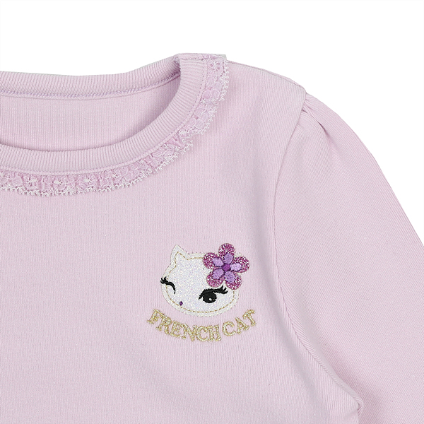 상품설명 연보라 컬러의 다이마루 티셔츠 입니다. 베이직한 아이템이기 때문에 많이 손이 가게 되고 속에 입기에도 무난한 아이템입니다. 고양이 아플리케를 넣어주어 프랜치캣만의 귀여운 느낌을 더해주었습니다. 원피스 안에 레이어드 해서 입거나 바지나 스커트에 코디하시기 좋은 데일리 아이템입니다.