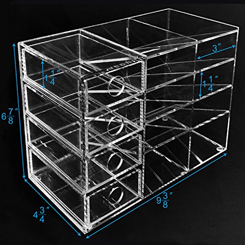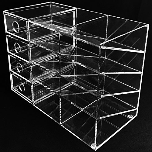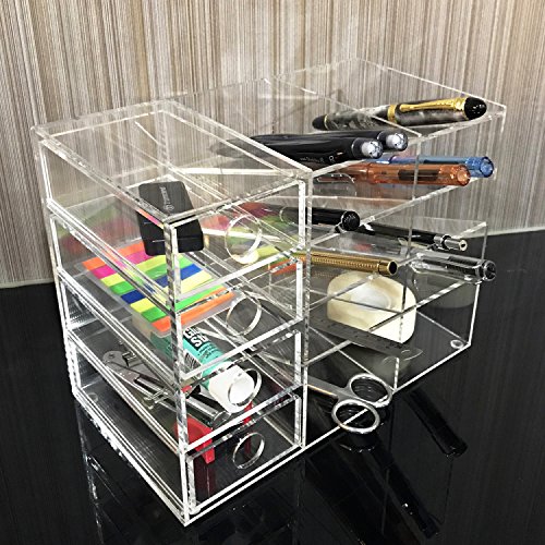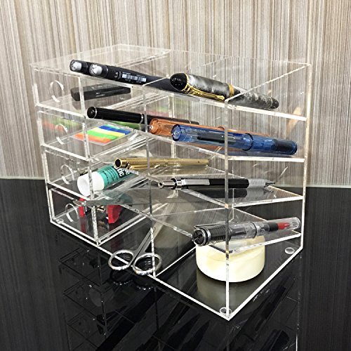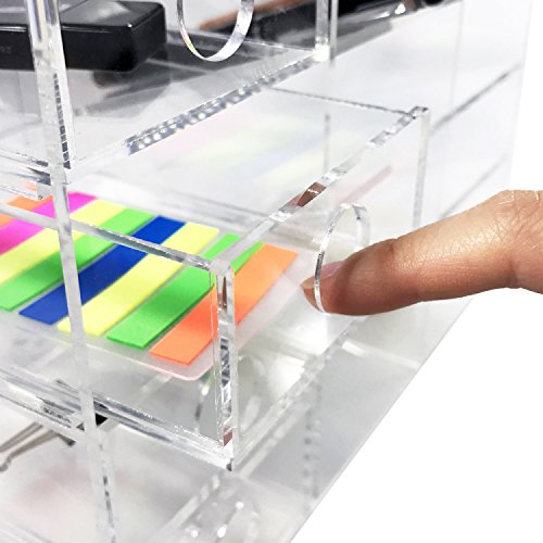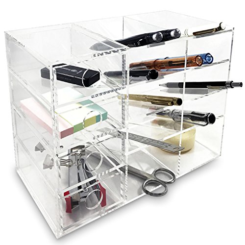 10 beveled-angle slots compartments perfect for holding scissors, pens, pencils and drawers to hold small items, such as clips, rubber bands, pins and more. Drawers open independently and are fully removable.