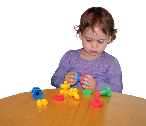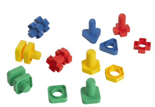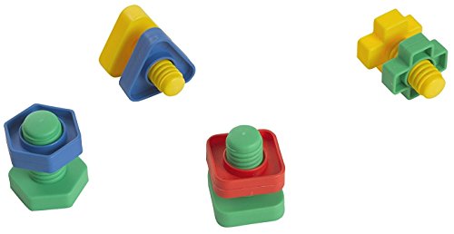 Use these oversized geometrically shaped nuts and bolts to promote bilateral coordination, motor planning, eye hand coordination, color recognition and fine motor skills. Helps increase attention and focus. Assorted bright primary colors in squares, triangles, crosses, and hexagons. Basic Size: 2 1/4" long x 1 5/8" wide. Large 48 piece set in reusable storage container.Feature
