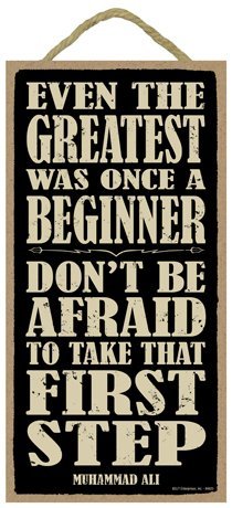 - "Even the greatest was once a beginner. Don't be afraid to take that first step - Muhammad Ali" Rustic wooden sign