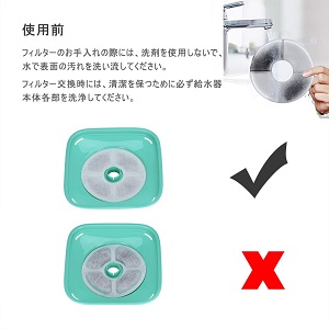 ・ペットファウンテン本体の洗浄時、活性炭フィルターは洗剤を使わずに水だけで洗い流してください。洗剤を使うと内部に洗剤が残留し、完全に洗い流すことができない恐れがあります。