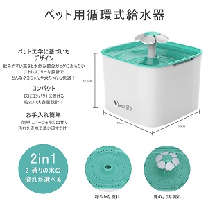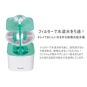【2L大容量】2Lの大容量を持つため、普通のペットに5-7日間新鮮な水を提供できます。短距離旅行や出張や急な残料などの場合に最適です。 【ダブルフィルター】交換可能な活性炭フィルターは水道水を常に軟水化し、皮毛、食べ残し、ほこりを取り除き、ペットの健康に役に立ちます。 【BPAフリープラスチック製】食品グレードの高品質BPAフリープラスチックを採用し、ペットの体に害を及ぼしません。また、清潔も簡単で、使用上には非常に簡単です。 【二つの飲み方】フラワーファウンテンの形で、三つの飲み方があります――「穏やかな川のような流れ」、「緩やかな水の流れ」 気まぐれな猫や犬にも対応できます。 【超静音設計、低エネルギー消費】水中ポンプを採用し、ノイズがあまりないので、夜になっても静かに使用できます。 しかも、低エネルギー技術が使用されており、1月1.5KWの低消費電力を実現し、20,000時間以上働きます。 コンセントが「CEマーク」を取得するので、長い時間でも熱くなりにくいです。