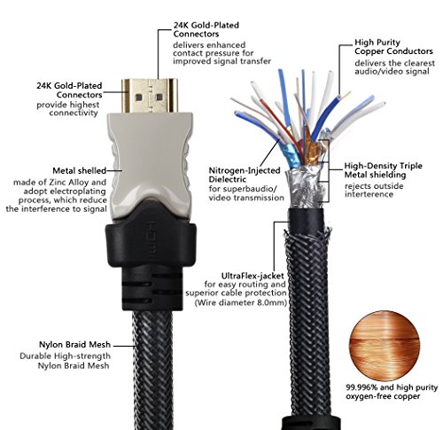 POLOK High-Speed HDMI Cable features 24K gold-plated, 99.996% and high purity oxygen-free copper, corrosion-resistant connectors. The shielding connectors are made of Zinc Alloy and adopt electroplating process. The cables' connectors have fine grinding, streamlined and science appearance showing the metallic texture. It comes with a durable, black, PVC, Nylon Mesh outer layer, which defends against outside interference, helping to maintain the integrity, purity of the digital signal