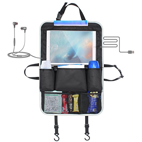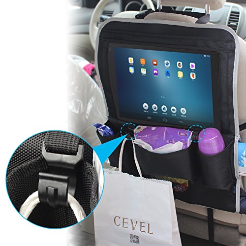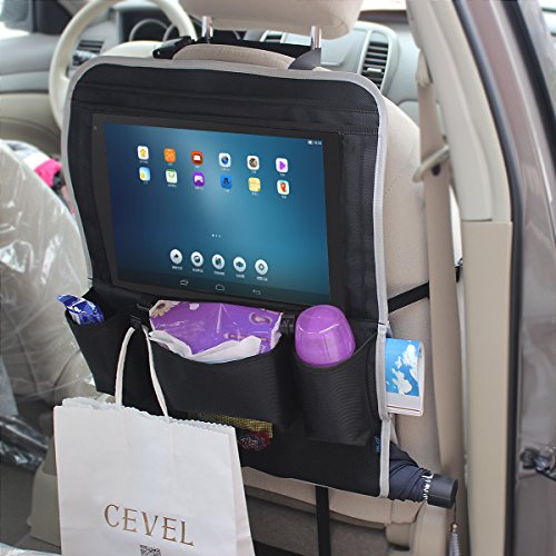 Unique features: Large touch screen tablet holder fits Android and iOS tablets up to 12.9" (iPad,Samsung etc.). There are 2 conceal zippers at the side of touch screen which is perfect for easy charging and enjoying music with earphone/headphone. Durable fabric with 1680D polyester.It's best partner for baby/kids/children during travel/weekend trip. Universal design for almost all of vehicles.
