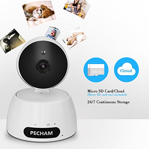 -. Feature : STUNNING HIGH DEFINITION VIDEO -This indoor security IP camera allows you to view your home on iOS or Android smartphone in 960P high definition resolution. Clear images and seamless video day or night using 6 infrared lights in dark conditions, which can be set to "on", "off" and "automatic". / TOTAL HOME MONITORING - Uses its remote control Pan/Tilt function of PECHAM wifi security surveillance camera for wide area monitoring and range. Can zoom horizontally 350 ° and vertically 100 ° to extend view. Keep an eye on kid, pet, and baby. / TWO WAY AUDIO - See and hear in home or office from anywhere that has internet. Utilizes two-way voice communication and intercom of wireless home security camera. Use your smartphone to communicate from anywhere. / A RELIABLE HOME GUARD - Works as a reliable home or office security camera. On-board motion detection camera can sense movement in range and automatically take pictures, video or send alarm notifications. Connect up to 32 devices to review the camera from anywhere in the world! / PLUG & PLAY CONVENIENCE - Simple to install and use. Simply scan QR code to download the Free App, to use with phone remotely or connect to PC. Record and playback with Multiple Storage Options(Micro SD card or Cloud), save any important moment for image and video storage.