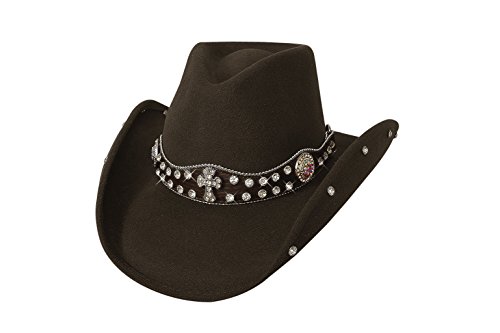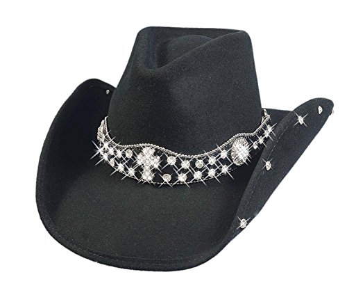 Studio : Montecarlo Hats LLC Bullhide Hat Co Publisher : Montecarlo Hats LLC Bullhide Hat Co Binding : Misc. Product Description Women's wool felt, western style hat with faux leather hat band, with crystal encrusted cross and Conchos. 3 3/4" brim. 0