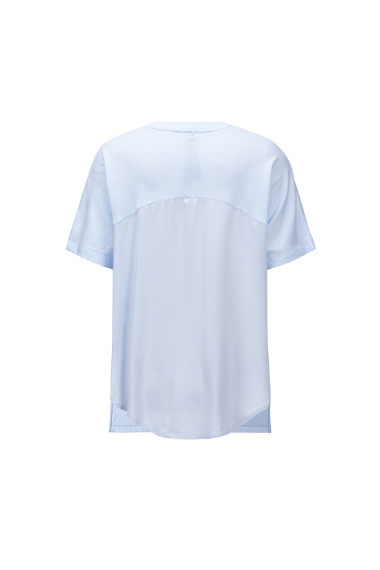- 소프트 터치의 저지와 우븐 소재를 믹스한 ego 여성 하모니 플레어 반팔티셔츠.