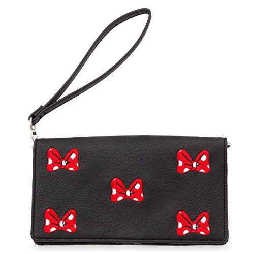 Features Minnie Mouse bows in embroidered applique - Snap closure Exterior pocket with additional snap closure